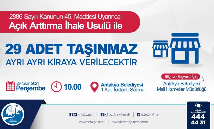 Antakya Belediyesi, mülkiyetinde bulunan 29 taşınmazı 29 Nisan 2021 Perşembe günü saat 10.00’da Antakya Belediyesi 1. Kat Toplantı Salonu’nda açık artırma ihale usulü ile kiraya verecektir.