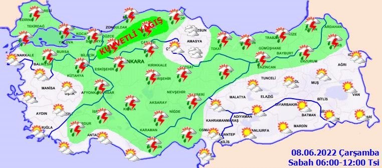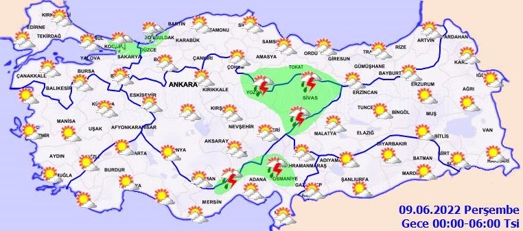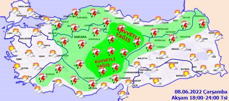 Meteoroloji Genel Müdürlüğü tarafından yapılan son değerlendirmelere göre: Ülkemiz genelinin parçalı ve yer yer çok bulutlu, Marmara, Akdeniz, İç Anadolu, Karadeniz, Doğu Anadolu'nun kuzeyi, Gaziantep, Kilis, Kütahya, Afyonkarahisar ve Van çevrelerinin yerel olmak üzere sağanak ve gök gürültülü sağanak yağışlı geçeceği tahmin ediliyor. Yağışların Karadeniz'in iç kesimleri (Bolu, Karabük, Kastamonu, Amasya, Tokat, Çorum, Gümüşhane, Bayburt, Artvin ile Sinop, Samsun, Ordu, Giresun ve Trabzon'un iç kesimleri), Akdeniz'in iç kesimleri (Isparta, Burdur, Antalya'nın kuzeybatısı, Kahramanmaraş'ın batısı ile Adana, Mersin ve Osmaniye'nin kuzeyi), İç Anadolu'nun güney ve doğusu (Kırıkkale, Sivas, Yozgat, Kırşehir, Kayseri, Nevşehir, Niğde, Aksaray, Konya, Karaman) ile Ankara, Çankırı, Kars ve Ardahan çevrelerinde yerel olarak kuvvetli olması bekleniyor.