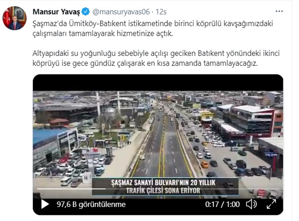 Sosyal medya hesapları üzerinden yaptığı paylaşımda Şaşmaz Sanayi Sitesi’nde yapılan çalışmalarda gelinen noktaya ilişkin vatandaşları bilgilendiren Yavaş, “Şaşmaz'da Ümitköy-Batıkent istikametinde birinci köprülü kavşağımızdaki çalışmaları tamamlayarak hizmetinize açtık. Altyapıdaki su yoğunluğu sebebiyle açılışı geciken Batıkent yönündeki ikinci köprüyü ise gece gündüz çalışarak en kısa zamanda tamamlayacağız” dedi.