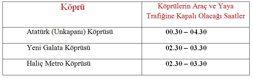 Ayrıca; Unkapanı, Galata ve Haliç Metro köprüleri, 02.30-03.30 saatleri arasında da deniz trafiğine açılacak.